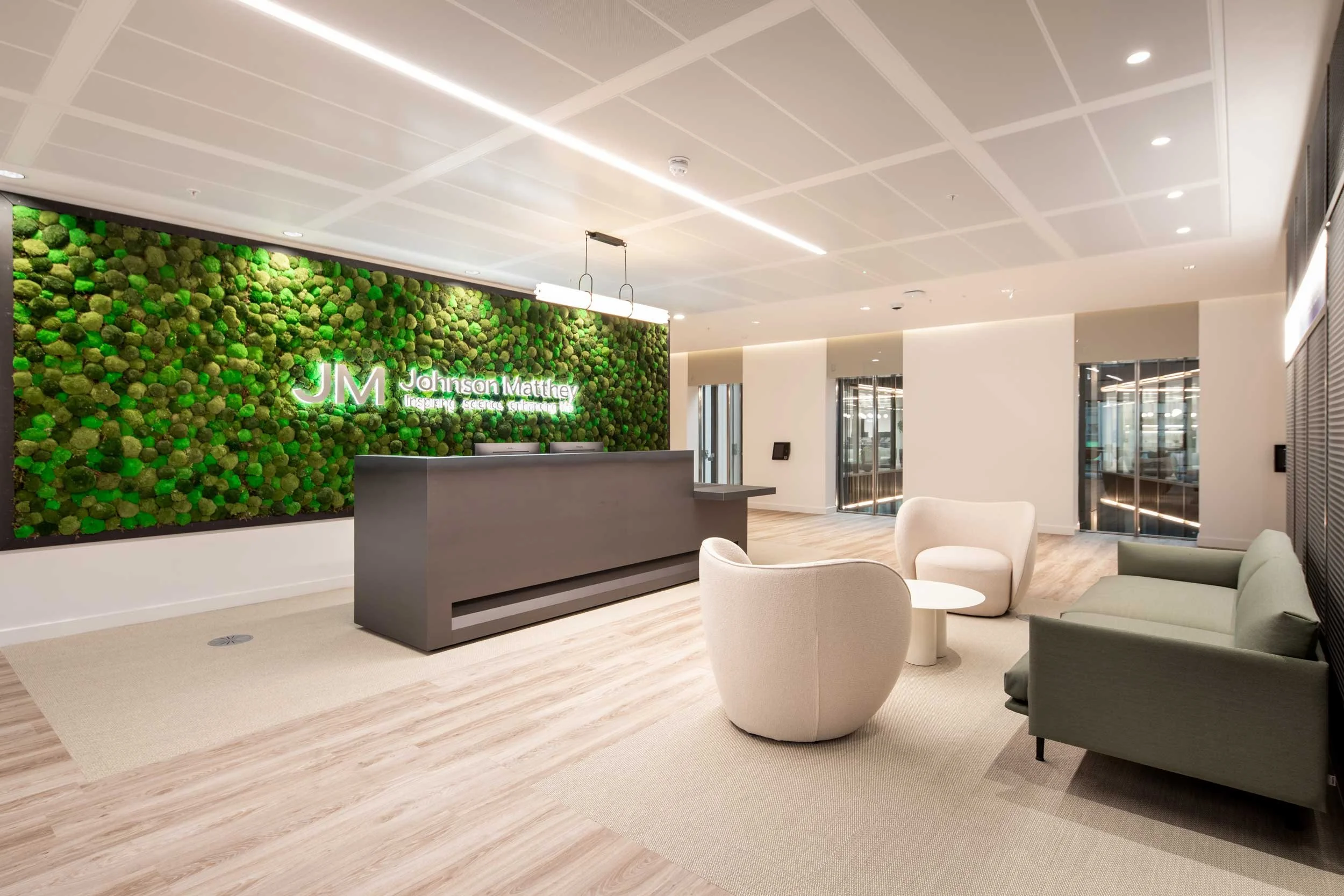 Sustainability and wellbeing were embedded throughout the design approach. Biophilic principles were incorporated through integrated planting and a strong connection to natural materials, while environmentally responsible sourcing helped reduce impact across the scheme. Reclaimed timber, recycled aluminium, recycled acoustic panels and low-VOC finishes were selected to align with the client’s values and long-term sustainability goals.